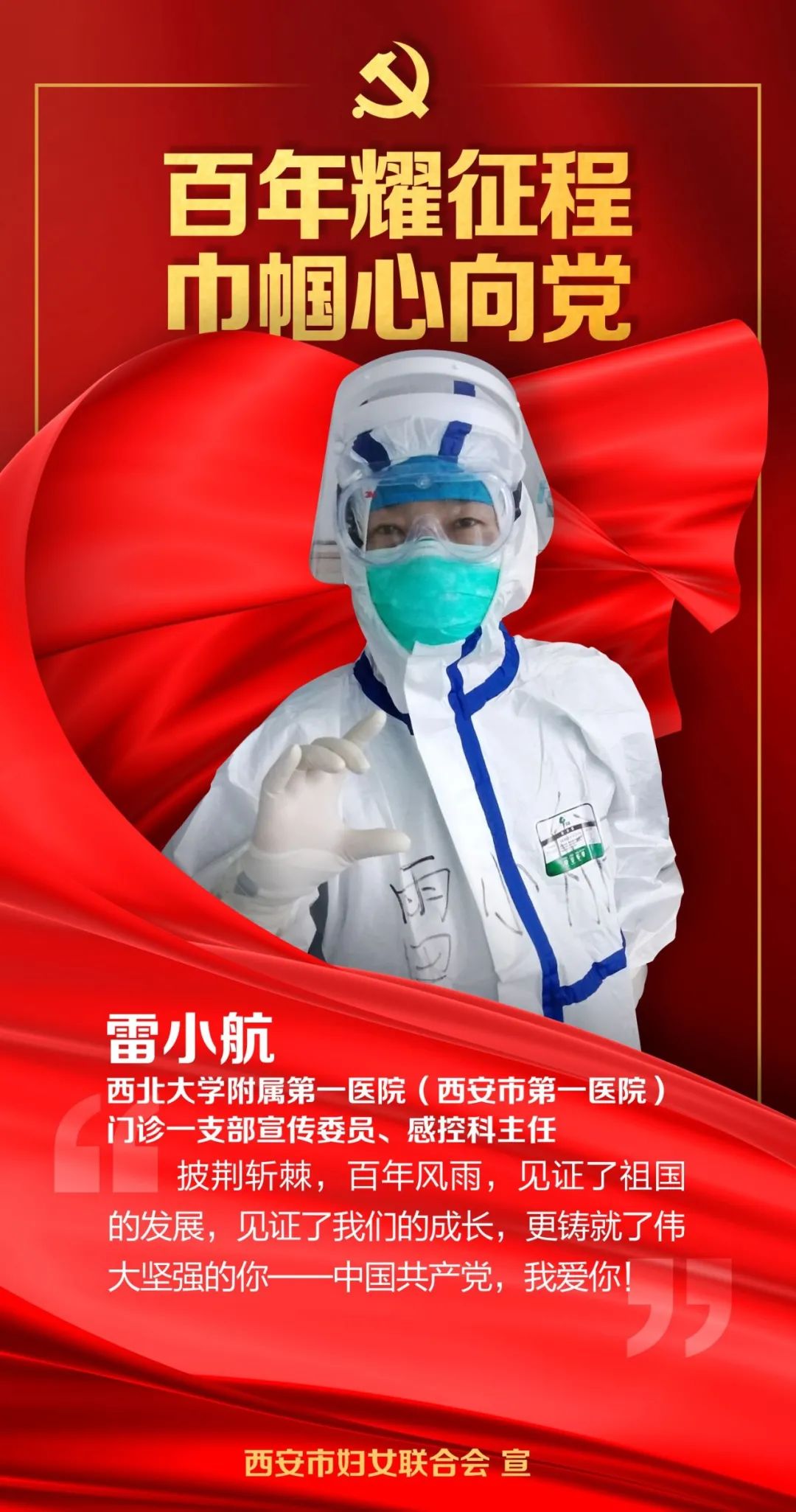 “永远跟党走 奋进新时代”,为庆祝中国共产党成立100周年,唱响“党的盛典、人民的节日”主旋律,讲好在中国共产党领导下广大妇女立足岗位建功新时代的生动实践,传递女性牢记责任使命、勇于担当作为和无私奉献的精神,市妇联开展巾帼献礼——“百年耀征程 巾帼心向党”西安市各行各业、各族各界优秀女性代表事迹展播。今天,让我们一起走近pg娱乐电子游戏官网入口附属第一医院(西安市第一医院)门诊一支部宣传委员、感控科主任雷小航,聆听她奔赴抗疫一线的动人故事。