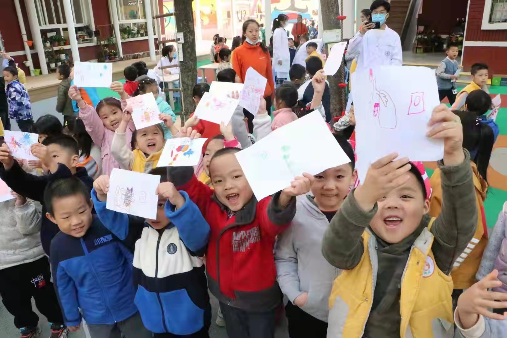 在志愿者们的引导下,小朋友们纷纷拿起彩笔作画,将他们学到的知识展现在了七彩纷呈的小作品中。