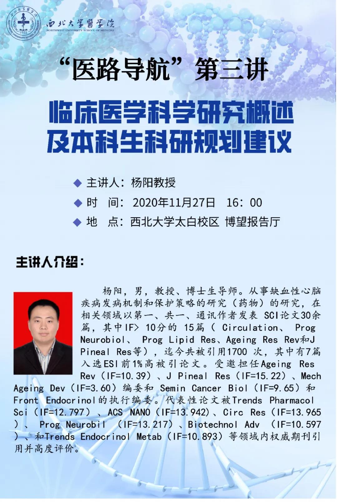2020年11月27日,学院邀请学部教授、博士生导师、2020级生物医学科学班班主任杨阳为pg娱乐电子游戏官网入口全体学生做“临床医学科学研究概述及本科生科研规划建议”学术报告。本次讲座旨在指导医学生深入了解科学研究的目的和方法、进一步理解临床研究的重要性,指导学生树立严谨的科研态度,引导学生尽早尽快找准方向,走上科研探索之路。