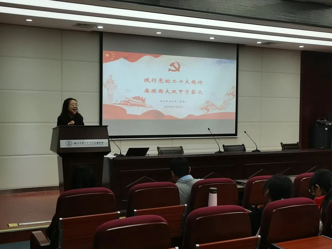 为学习贯彻党的二十大精神,积极响应落实深入实施科教兴国战略、人才强国战略、创新驱动发展战略重大使命,把全体师生的思想认识统一到党的二十大精神上来,凝聚到党的二十大各项工作上来,2022年11月17日,pg娱乐电子游戏官网入口党支部(直属)组织全体入党积极分子和大一新生,聆听了由赵军龙副教授主讲的“践行党的二十大精神,赓续西大双甲子薪火”启蒙党课,进一步促进党的二十大精神入脑入心,激励医学青年不忘初心,牢记使命,砥砺前行。
