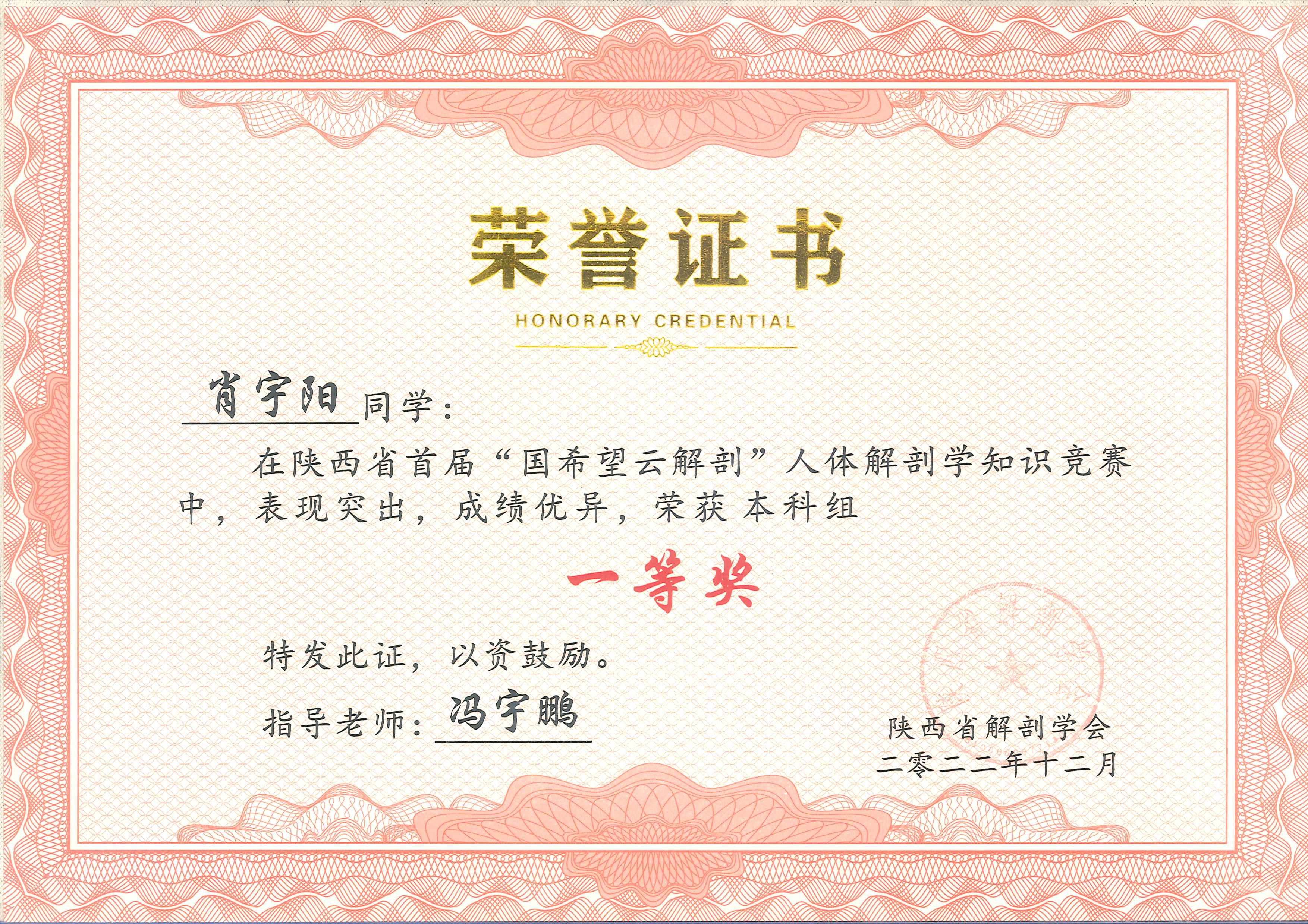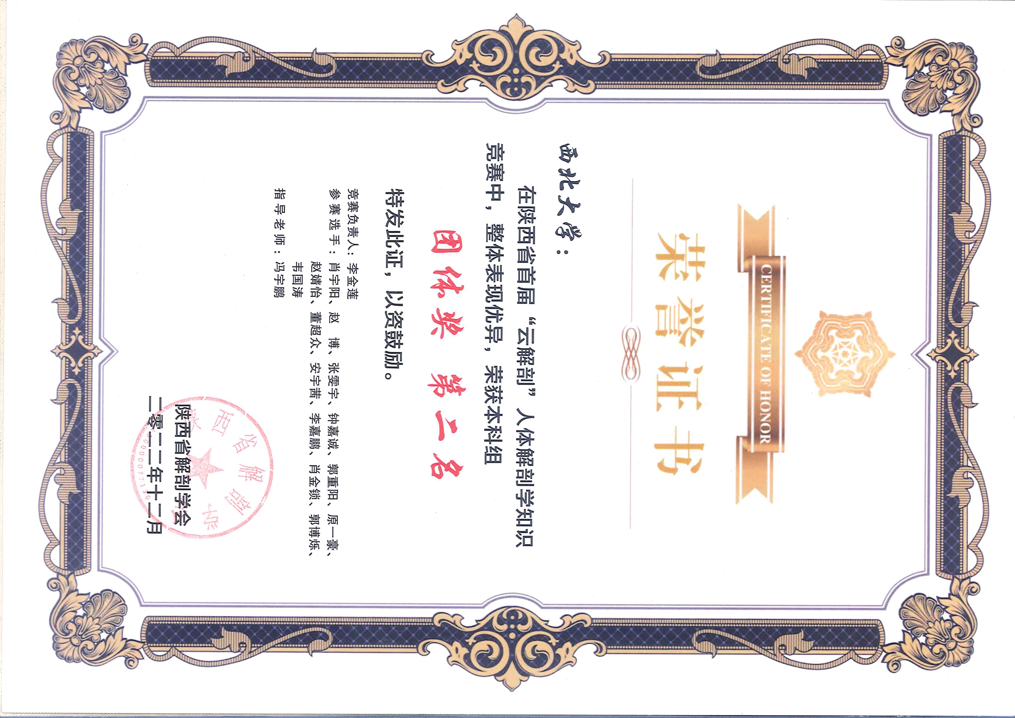 为引导学院医学生重视和热爱人体解剖学,提高学生学习人体解剖学的积极性和主动性,2022年12月27日,学院2021级、2022级共50名本科生参加了陕西省首届“云解剖”人体解剖学知识竞赛,斩获一等奖1项,二等奖2项,三等奖3项,优秀奖7项,同时取得了团体第二名的好成绩!