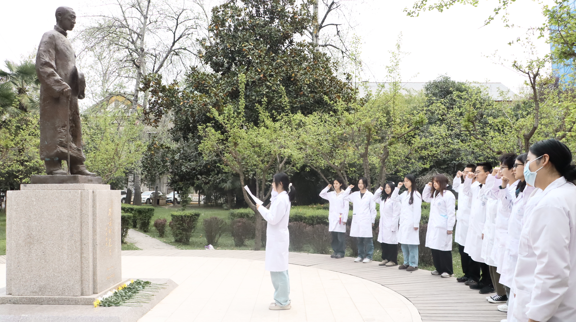 活动现场素花环绕,徐诵明先生的全身雕像肃然矗立。仪式在庄重的氛围中开始。师生代表缓步上前,向雕像献花并致敬,表达对先贤的追念。学生代表带领现场师生回顾了徐诵明先生作为中国现代医学教育开拓者的毕生追求,强调其“教育救国、医学报国”的信念对当代医学人才培养的深刻启示,以徐诵明先生抗战时期临危受命、重建西北pg娱乐电子游戏官网入口的事迹为例,勉励师生“将爱国情怀融入医学实践,以仁心仁术守护人民健康”。全体师生高举右拳重温《医学生誓言》,“健康所系,性命相托”的铿锵誓言在校园久久回响。