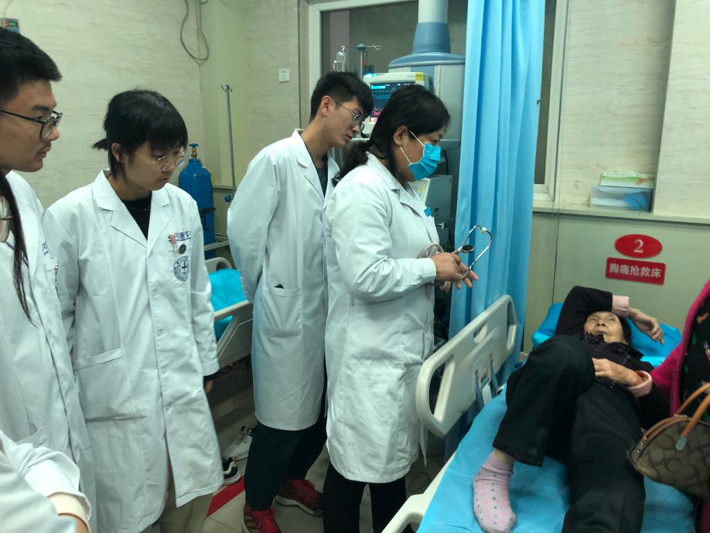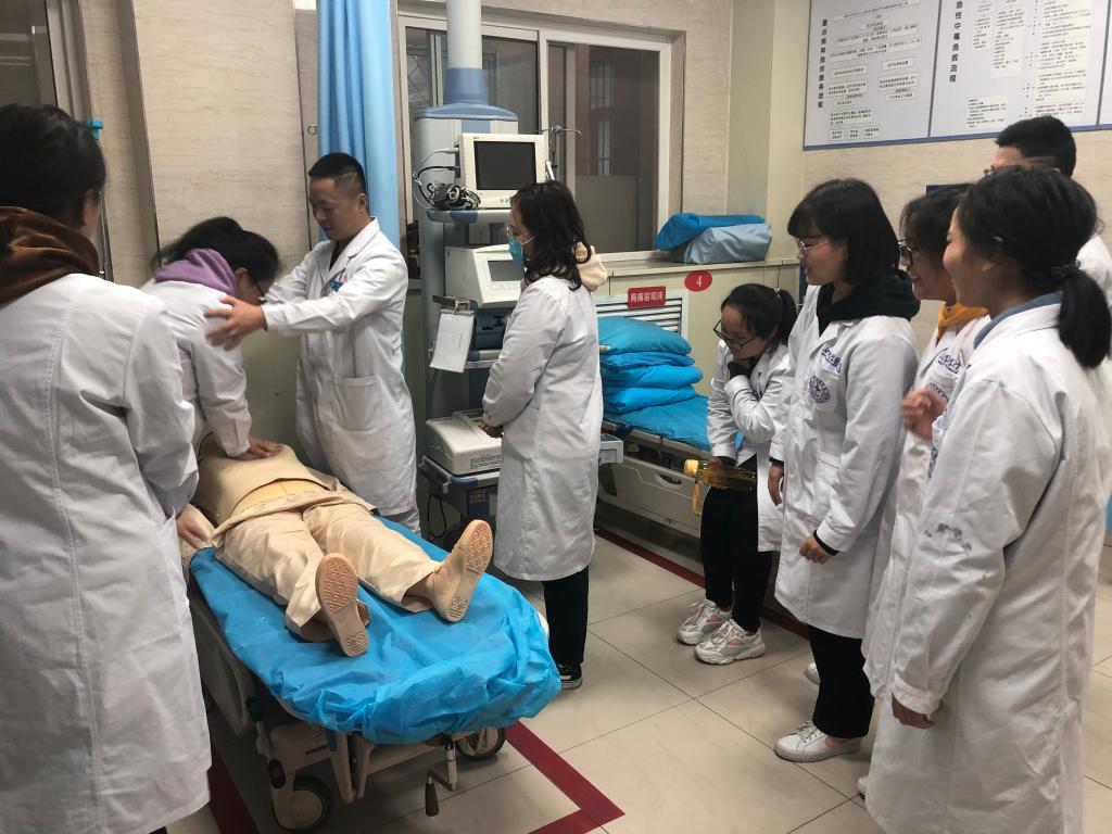 见习同学首先参观了急诊室各功能区,听取了科室负责人关于场地设置、人员配置及排班、设备设施、患者就诊流程等情况介绍。在急诊门诊、急诊抢救、急诊病房区域,全体学生观摩了急诊科室早交班工作,见习了临床坐诊过程中患者就诊流程及病情诊疗经过,接触了小讲课+临床技能培训(心肺复苏、电除颤等)等教学内容。