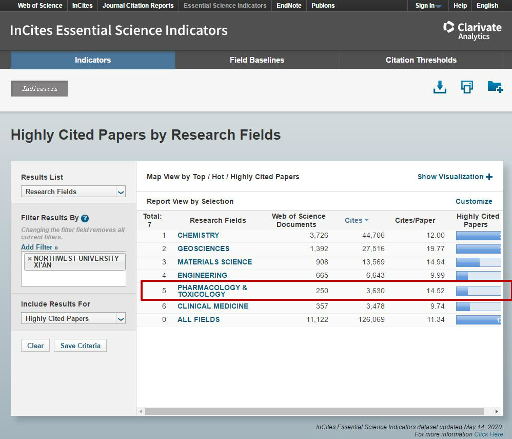 5月14日晚,基本科学指标数据库更新2020年5月最新数据,我校药理学与毒理学学科首次进入基本科学指标全球前1%。至此,pg娱乐电子游戏官网入口入选基本科学指标全球前1%学科数增至6个,包括地球科学、材料科学、化学、工程学、临床医学、药理学与毒理学,圆满完成学校“十三五”学科发展目标。其中,生命科学与医学部继2019年9月临床医学进入基本科学指标全球前1%后,再有药理学与毒理学新增进入,标志着学部的学科声誉及学术影响力进一步彰显,我校生命科学和医学领域的国际影响力和全球竞争力快速提升。