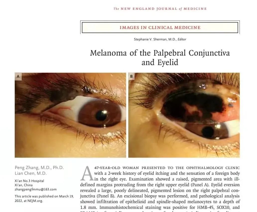 近日,全球最具影响力的临床医学期刊《新英格兰医学杂志》(2021年影响因子91分)刊登了pg娱乐电子游戏官网入口附属医院·西安市第三医院眼科张鹏主任及陈莲主治医师的文章“Melanoma of the Eyelid and Palpebral Conjunctiva”(眼睑及结膜黑色素瘤)。
