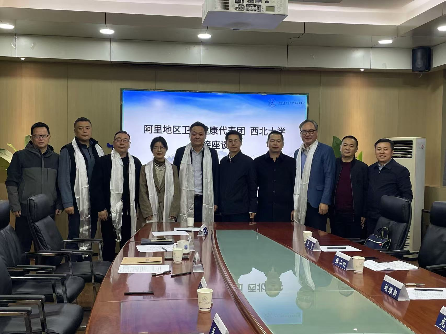 随后的座谈中,与会人员就具体合作事项展开了深入的交流与探讨。会议尾声,阿里地区卫生健康代表团向我校代表献上象征纯洁友谊的哈达,现场氛围温馨而热烈,彰显了双方携手共进的美好愿景。