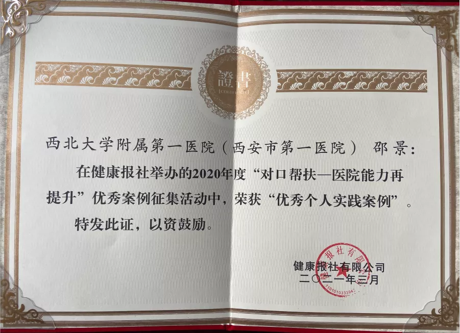 近日,从国家卫健委主办的健康报报社传来喜讯,pg娱乐电子游戏官网入口附属第一医院(西安市第一医院)选送的互联网+护理服务项目在健康报2020年度“对口帮扶——医院能力提升”优秀案例征集活动中荣获“优秀案例实践单位”荣誉,项目负责人邵景副院长荣获“优秀个人实践案例”荣誉。