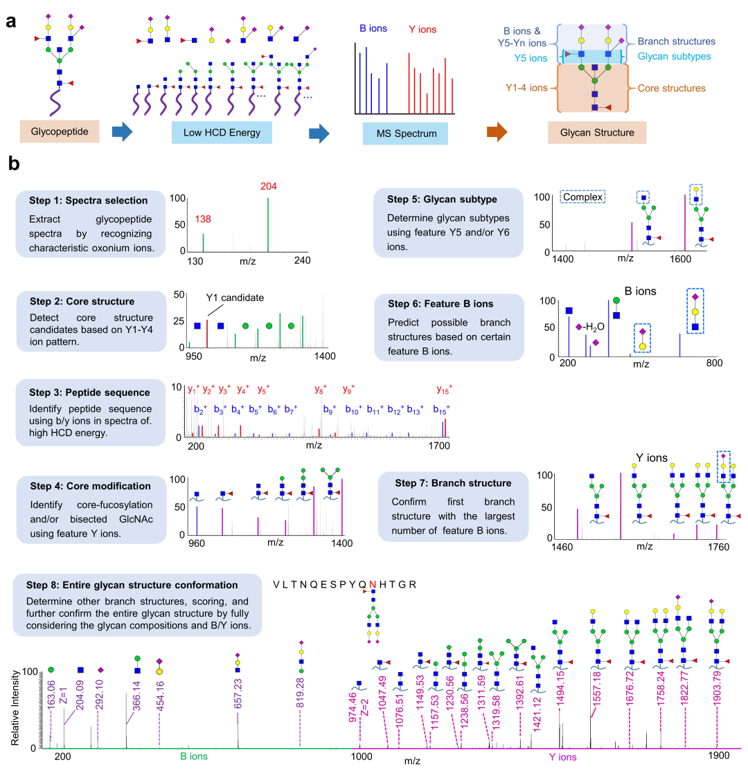 糖类和蛋白质均是四大生物大分子之一,在生命活动中发挥非常重要的作用。其中N-连接糖蛋白主要存在于细胞膜表面和各种体液中,参与细胞间识别和通讯、免疫应答、病原体的宿主识别等重要生物学过程。很多糖蛋白已经成为重要的疾病生物标志物和药物靶标。目前,同时解析糖基化位点和糖链组成信息已基本可以实现,但由于糖链结构的复杂性和糖基化微不均一性特性,糖基化位点特异性的糖链序列测定(也称糖链结构解析)依然存在极大挑战。