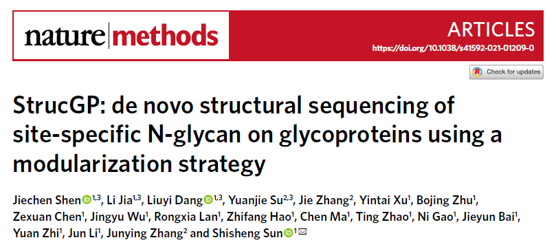 2021年8月2日,我校孙士生教授课题组与西安电子科技大学张军英教授课题组联合团队的重要研究成果在线发表在Nature Methods杂志上。成果以“StrucGP: de novo structural sequencing of site-specific N-glycan on glycoproteins using a modularization strategy”为题,介绍了一种可解析糖蛋白上糖链序列的新方法及其配套软件StrucGP,并描述了其技术细节。